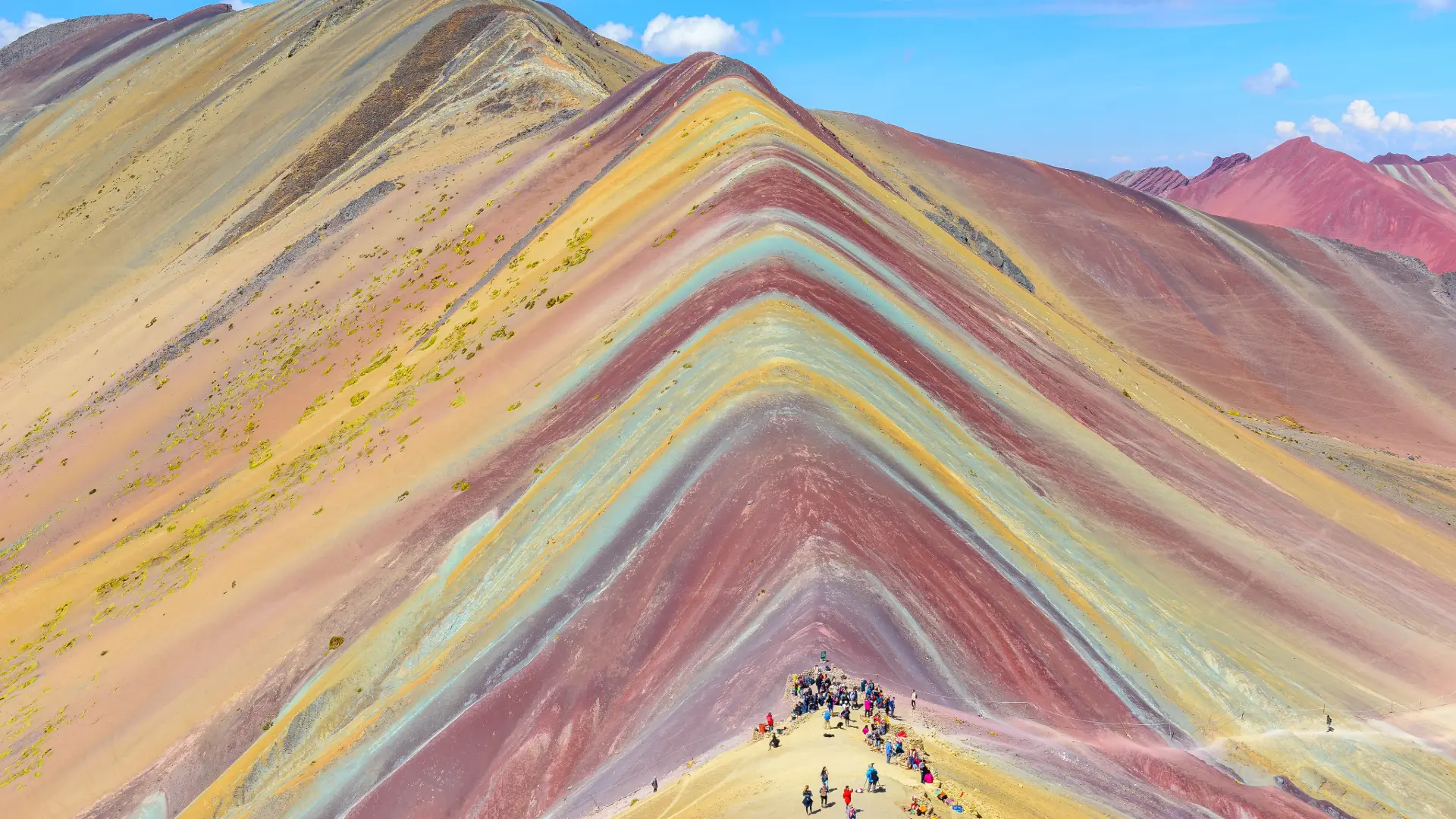 En la cima (5,200 m.s.n.m.) podrás contemplar los colores únicos de la montaña, formados por minerales naturales. Tendrás entre 30 a 45 minutos para explorar y tomar fotos inolvidables. Opcionalmente, puedes visitar el Valle Rojo, una joya poco visitada que parece de otro planeta (entrada opcional, 20 soles).
